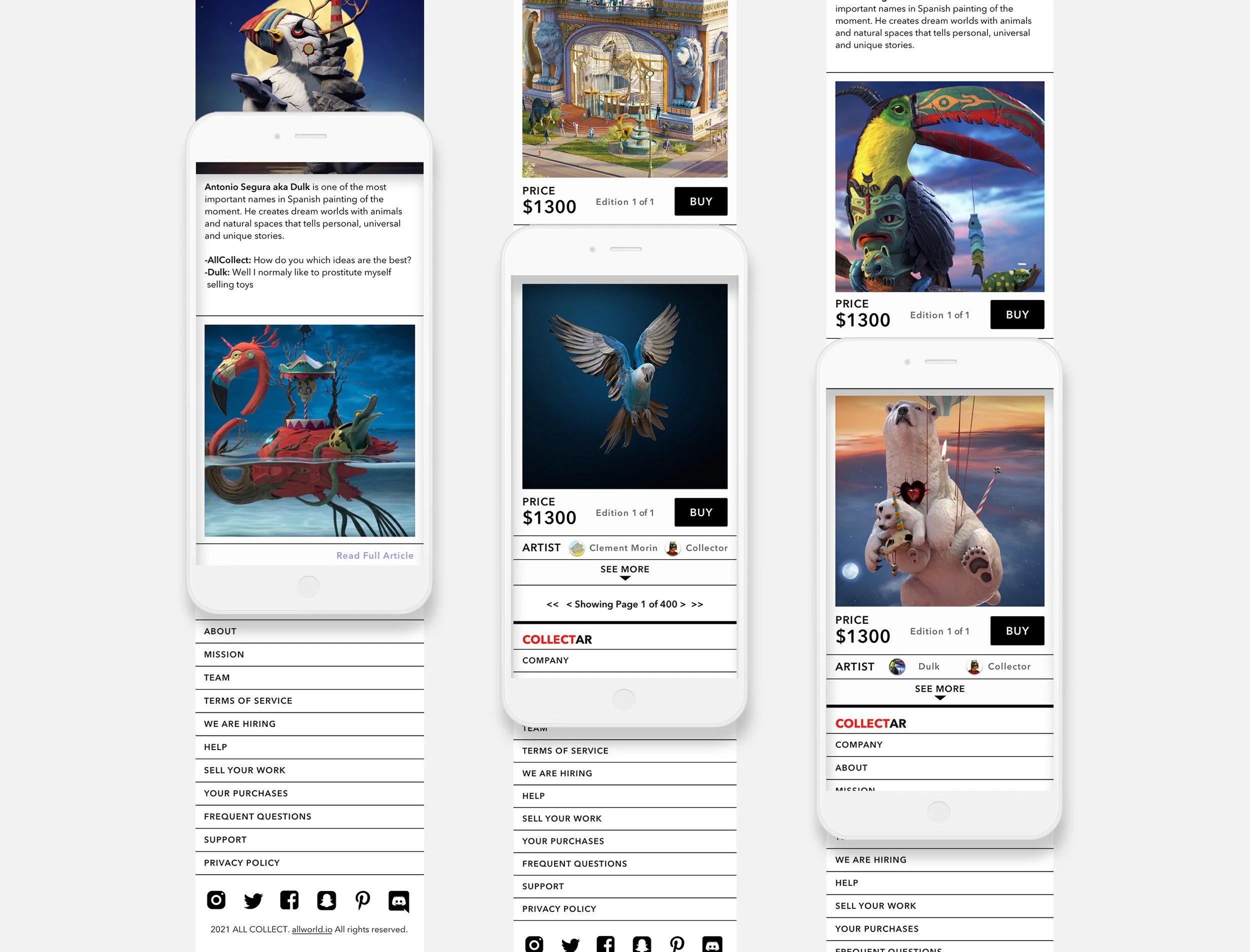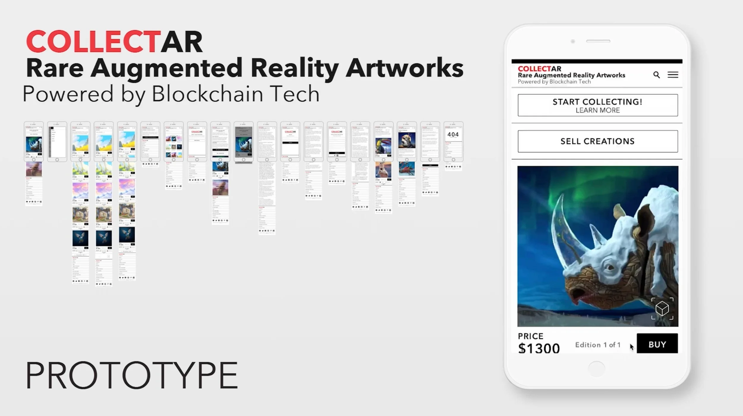 While designing out CollectAR, Sebastion (Studio Director & Founder) wanted an online auction house platform that incorporated the elements of a normal NFT website but focused on a subsect of art mainly focused on augmented reality-based work. Being a Designer, who works in the field of augmented reality, Sebastian wanted a platform for this subsect of artists that provided the capabilities for the art to be previewed in a three-dimensional space on mobile instead of just a flat image on a phone screen, something currently not being provided in the NFT marketplace. Aesthetic-wise, the platform was akin to Instagram's personal feed that simulates a polaroid photo style feed, something that doesn't take away from the work itself and is easily organized.